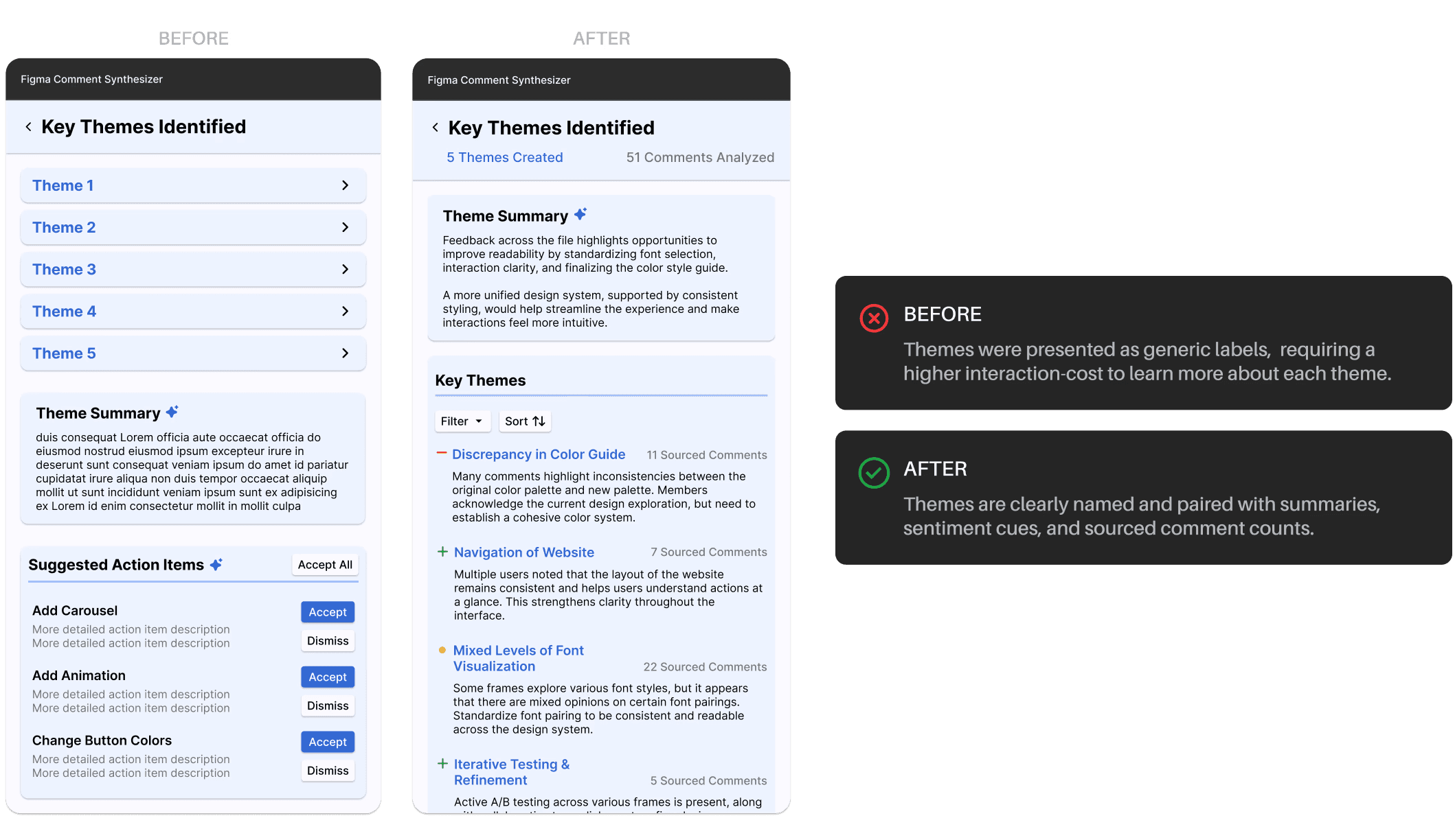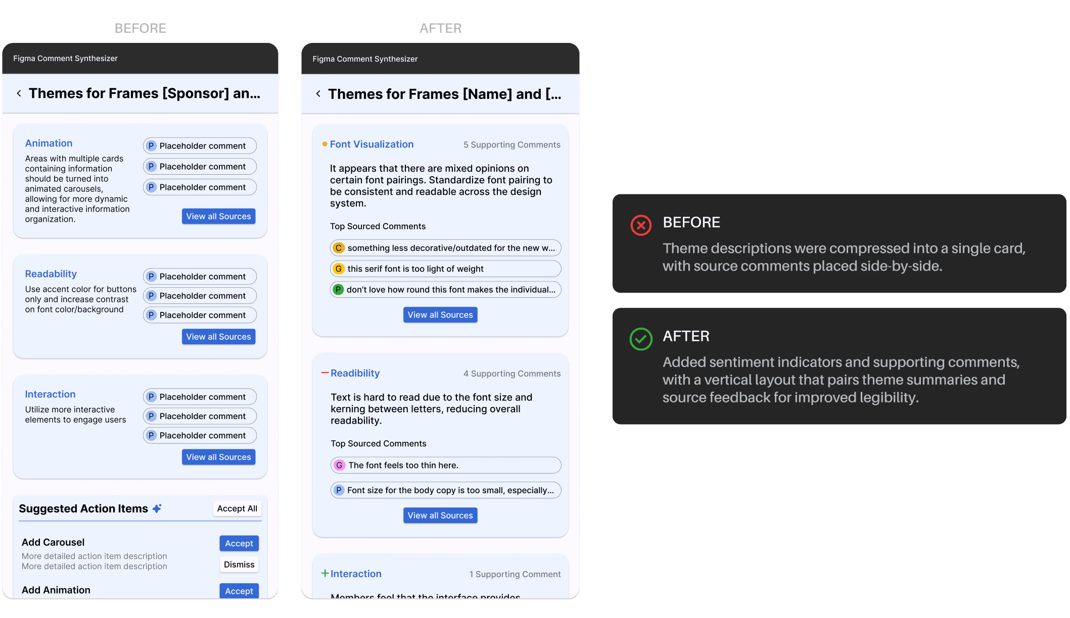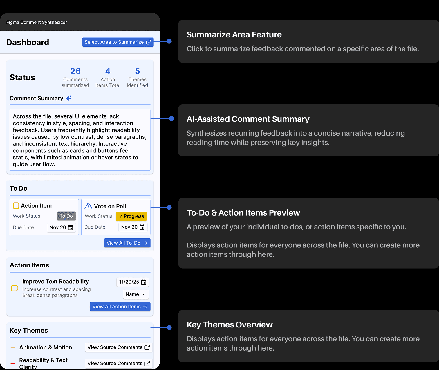 Our team designed an AI-assisted Figma plug-in that transforms scattered design comments into clear themes, prioritized action items, and collaborative decision tools, helping teams move from feedback overload to confident next steps.