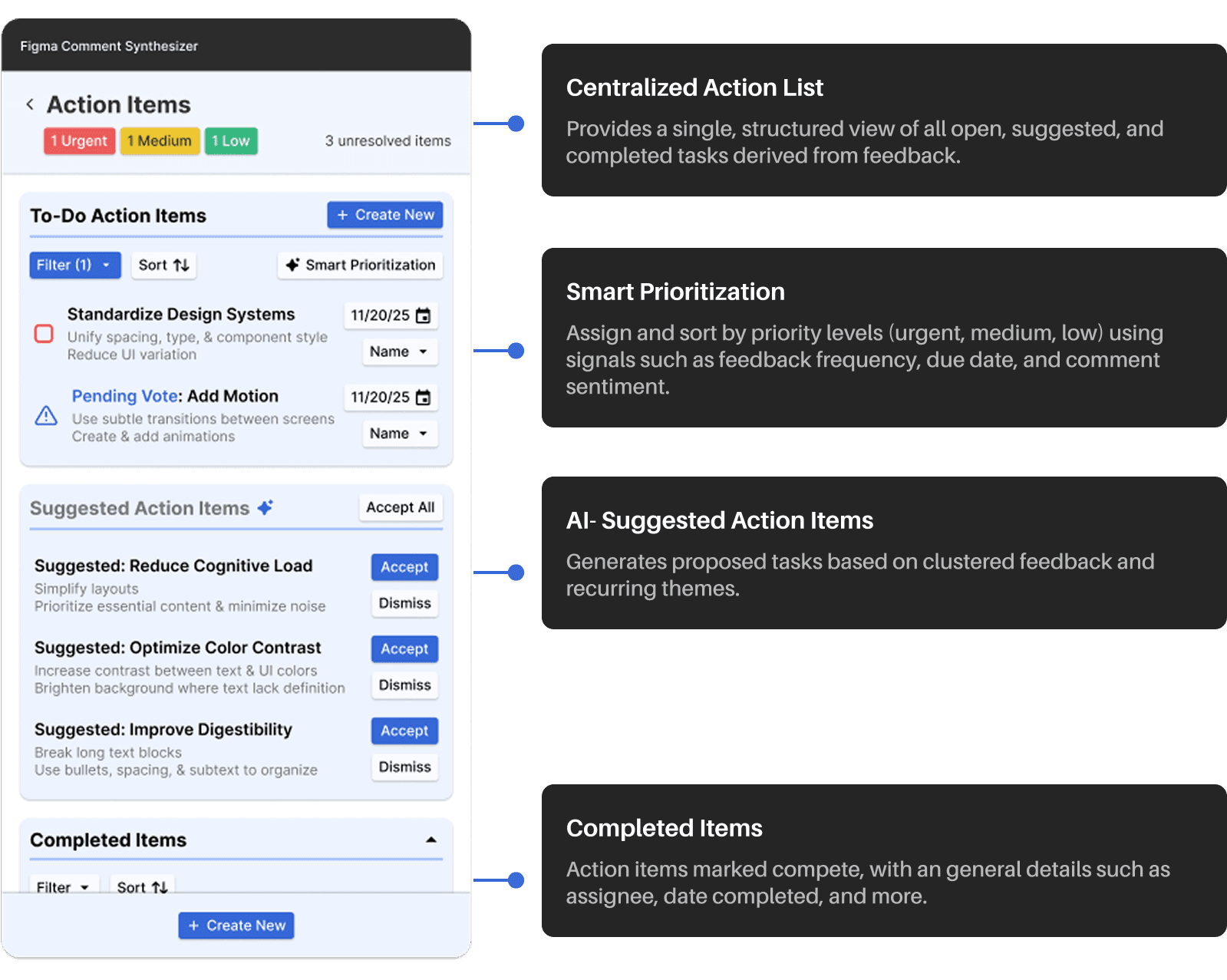 Once feedback has been synthesized, designers need a place to act. The Action Items view translates themes and insights into concrete, trackable work, helping teams move forward without losing context or intent.