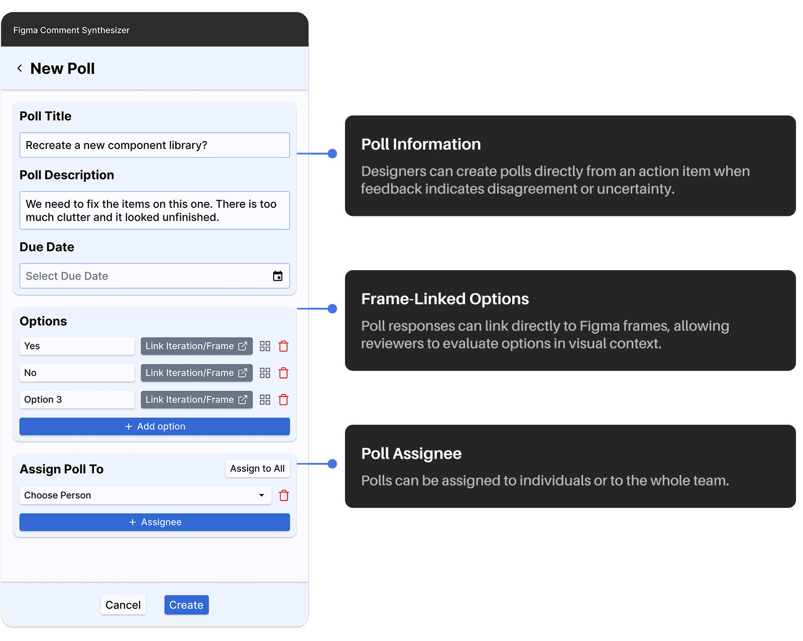 Some feedback can’t be synthesized. Polls surface disagreement and help teams align on decisions directly within action items, keeping discussion grounded in design context.