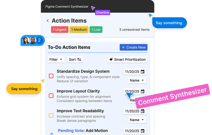 As files grow, designers face dozens, sometimes hundreds, of fragmented, repetitive, or conflicting comments spread across frames, files, and reviewers.