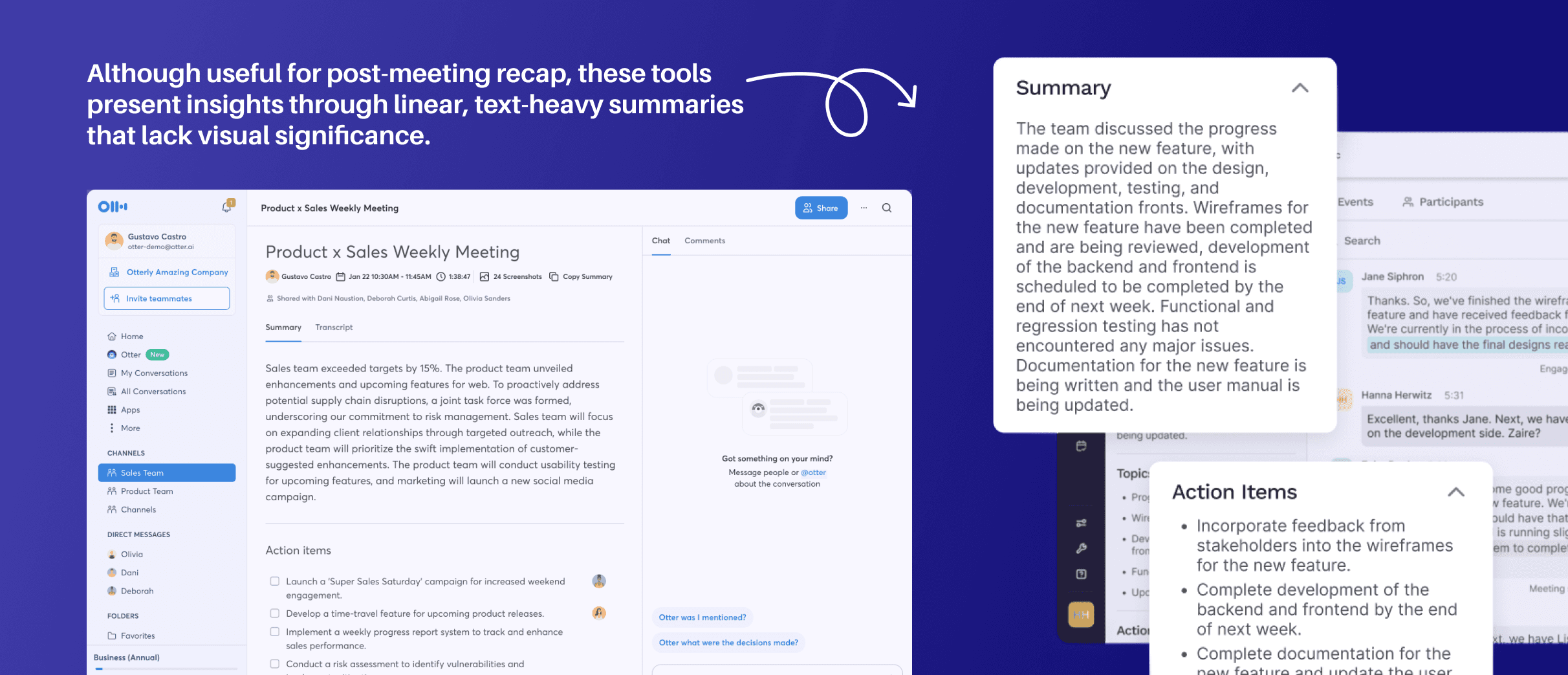 Otter.ai and Read.ai excels at transcription and meeting summaries, but outputs remain linear and text-heavy. Insights lack visual structure, clustering, or connection to design context.