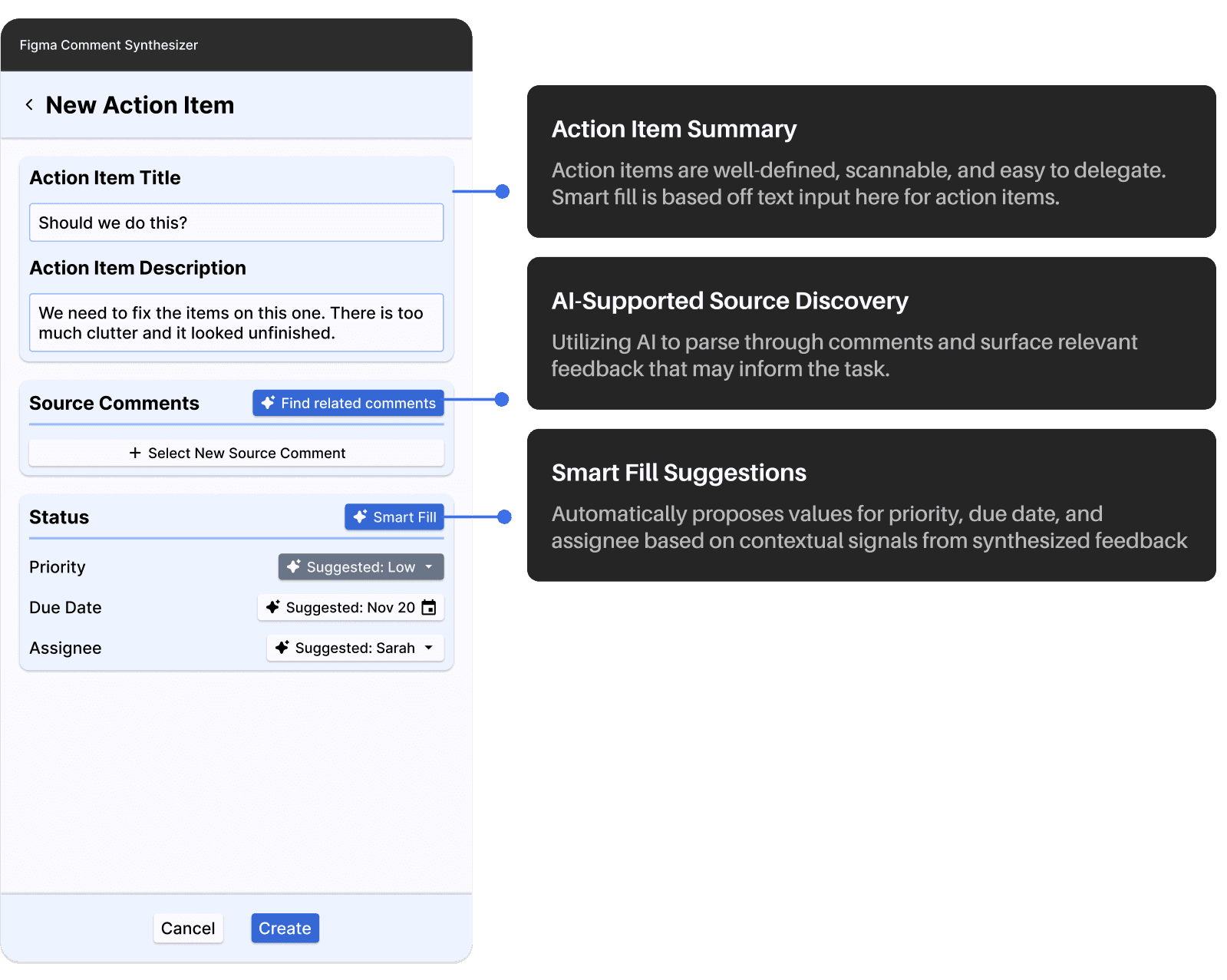 Rather than requiring designers to manually interpret feedback and configure every field, the system accelerates task creation by linking potentially related comments, or smart filling the action item based on context.