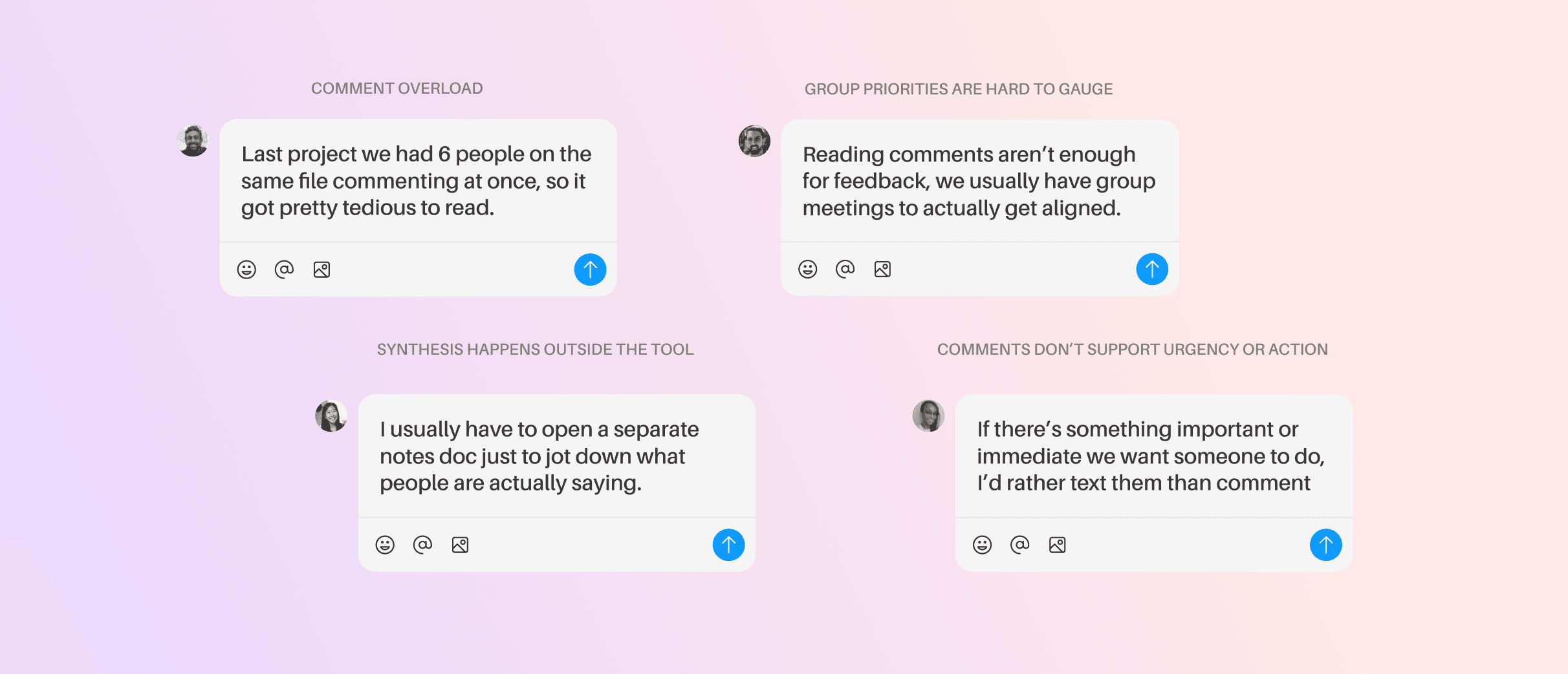 Developed within a design course, this project drew on our immediate design community as a primary research source. We spoke with designers who regularly use Figma to understand real-world feedback synthesis practices.