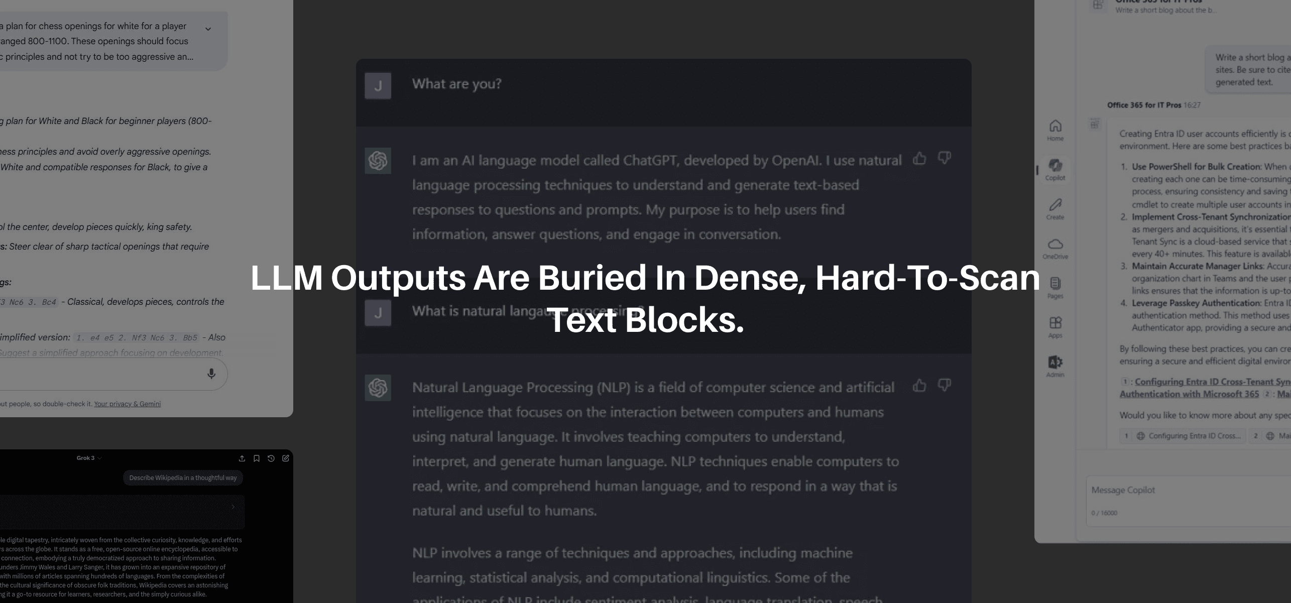 LLMs excel at producing summaries, but without visual hierarchy or interaction, patterns and priorities are hard to identify. Valuable insights become buried in text, increasing cognitive load instead of reducing it.