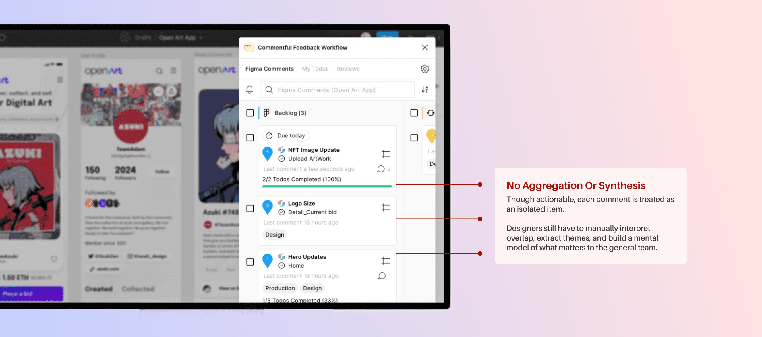 As comments multiply, designers must manually track repetition, consensus, and priority.